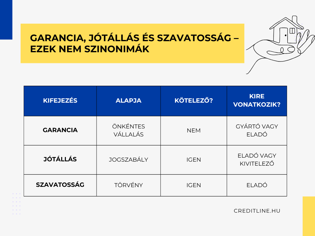 A jótállás nem a garancia szinonimája, mégpedig azért nem, mert ha ezt jogszabály írja elő, akkor kötelező. Ez lényegében a vevő felé egy könnyebbség, ugyanis az eladónak kell bebizonyítania, hogy a jótállási időn belül a termék vagy szolgáltatás hibája nem gyártási vagy kivitelezési eredetű. A 275/2013. (VII.16.) Kormányrendelet 3 év kötelező jótállást fogalmaz meg az újépítésű lakásokra vonatkozóan.