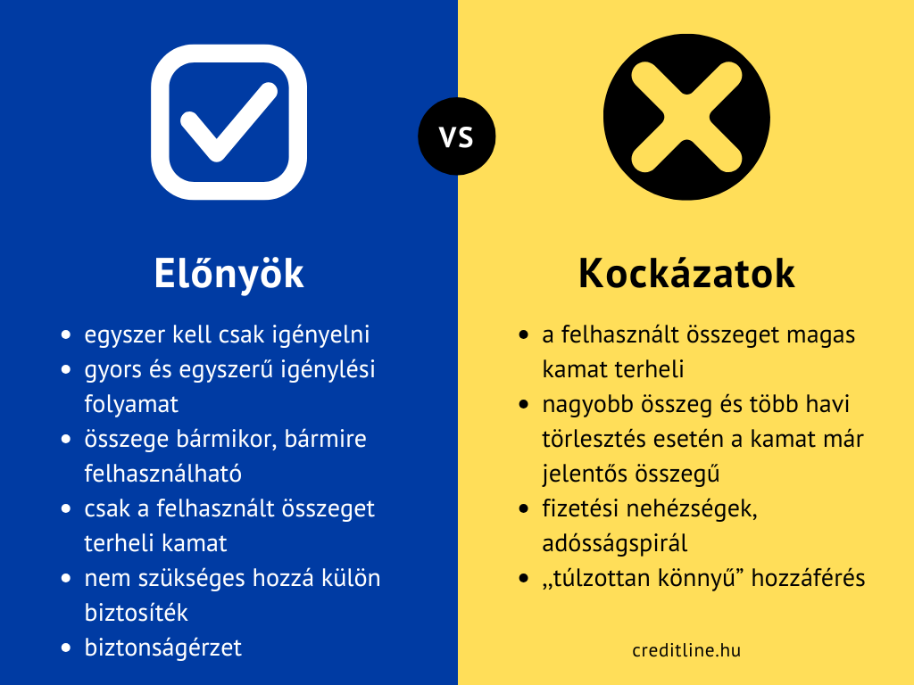 Szintén fontos előnye, hogy csakis a felhasznált összeg után kell kamatot fizetünk. Ameddig nem költünk a hitelkeretből, addig jellemzően ingyenes. A szolgáltatáshoz nem szükséges ingatlanfedezet vagy más biztosíték, csak a rendszer jövedelmünk.