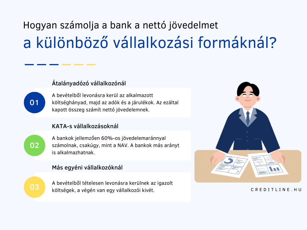 Vállalkozói hitel esetén a nettó jövedelem számítása elsősorban attól függ, hogy milyen vállalkozási, adózási formát választottunk. Ezek alapján pedig máshogy számítandó például egy átalányadózó és egy KATA-s vállalkozó nettó jövedelme.