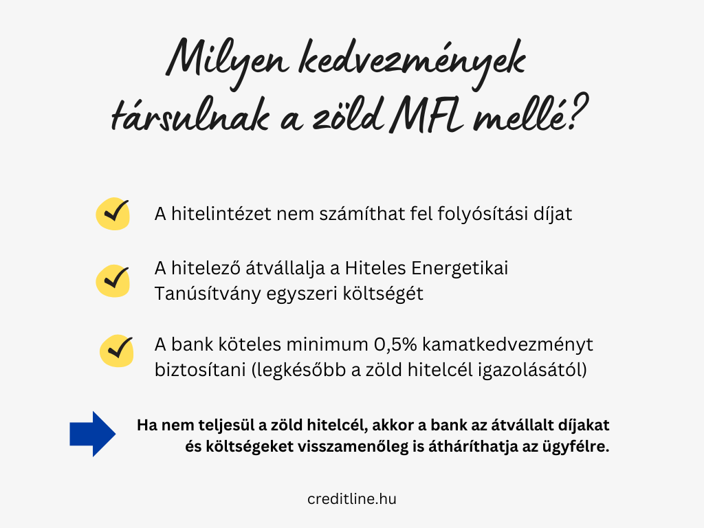 Amennyiben megvalósul a zöld hitelcél, akkor a bankoknak minimum 0,5 százalékpontos kamatkedvezményt kell adnia az igénylőknek egy azonos, nem zöld célú MFL-termékhez képest. Ez pedig még nem minden: a bankok nem számolnak fel az összeg folyósításáért díjat és egyszer átvállalják a Hiteles Energetikai Tanúsítvány (HET) díját is. (Az utóbbi csak abban az esetben jár, ha a zöld hitelcél igazolásához szükséges a HET benyújtása.)