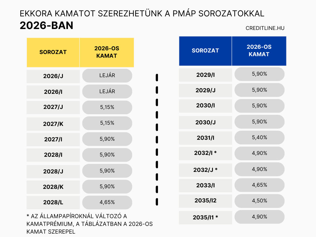 Ezek alapján a 2026-os kamatfordulókat követően a prémium papír kamata 4,5% és 5,9% között fog alakulni. Az egyes sorozatok kamatai a táblázatban láthatóak.