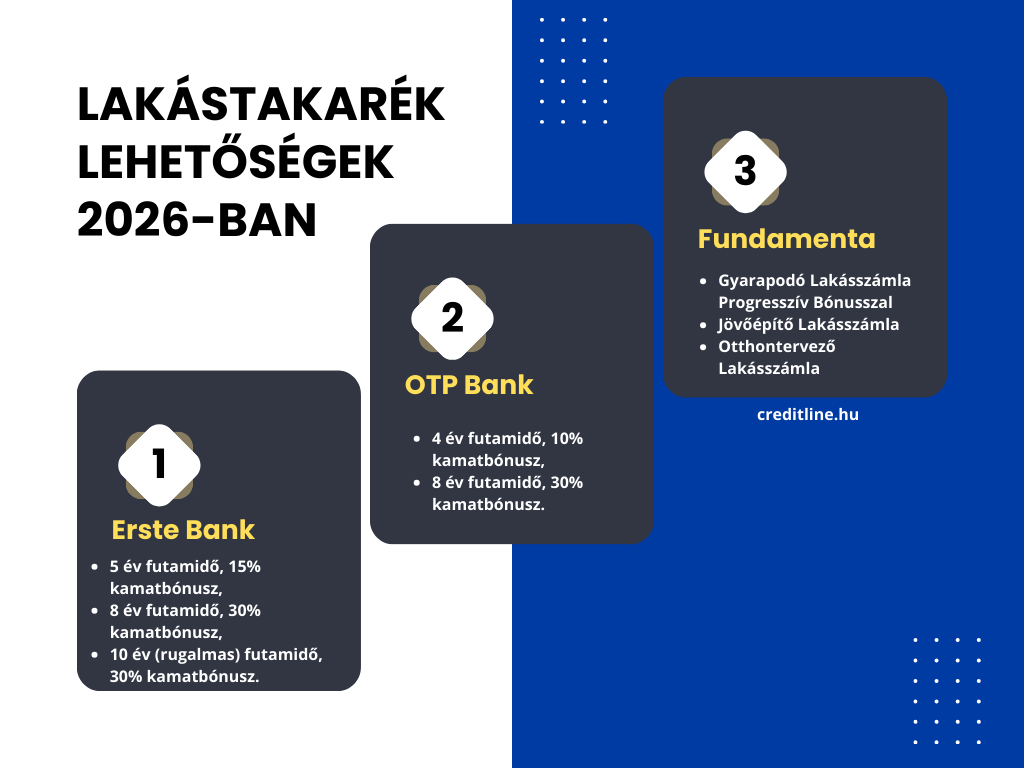 Azzal fontos tisztában lenni, hogy a szolgáltatók különféle konstrukciókat kínálnak. Jelenleg az Erste Bank, az OTP Bank és a Fundamenta kínál ilyen lakáscélú megtakarítást. Nézzük meg, hogy melyik konstrukció mit tud 2026-ban!